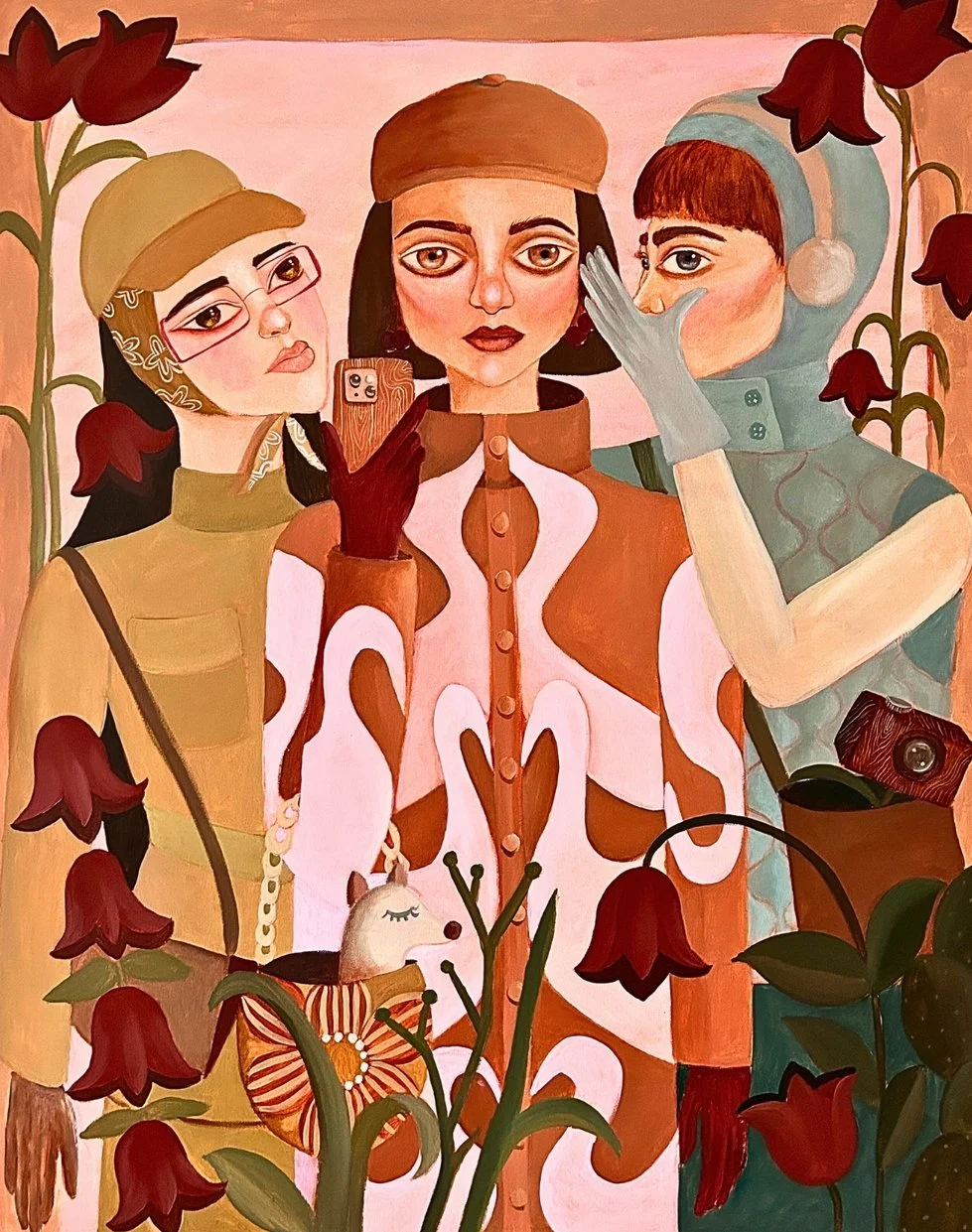 The figures here live in that space between performance and presence. The central one holds up a phone like a mask, the others lean in—whispering, curating, arranging themselves for an unseen audience. Flowers bloom and bend around them, both framing and consuming, like the endless scroll of images we get lost